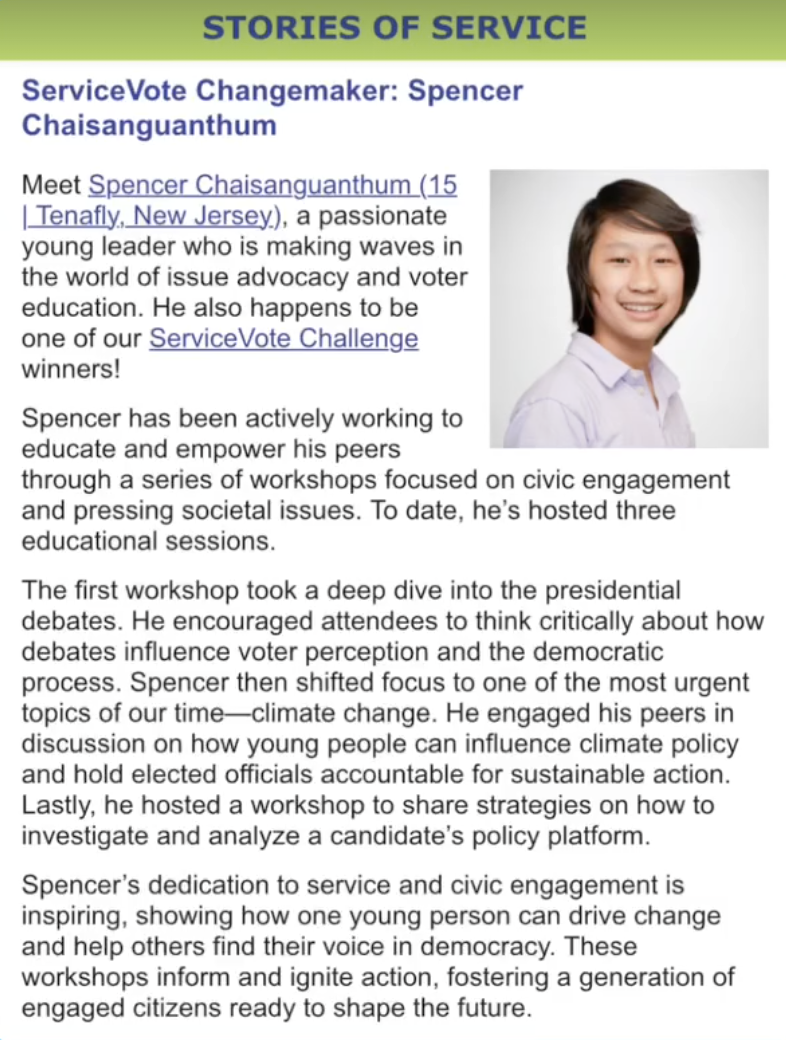 Spencer has been personally recognized by New Jersey Governor Phil Murphy, Points of Light, and Razom for Ukraine. He is a two-time Hershey Heartwarming Hero and an Everyday Young Hero. Recently, Spencer won the AmeriCorps We Serve to Remember Grant, Ashoka Changemakers Time for Change Youth Challenge, Bill of Rights Institute MyImpact Challenge, Cornell University National Contribution Project Award, Daily Points of Light Award, Karma for Cara Microgrant Award, President’s Volunteer Service Award, New Jersey Department of State Martin Luther King Jr. Commemorative Commission, New Jersey State Governor’s Volunteerism Award, and Youth Service America ServiceVote Challenge.