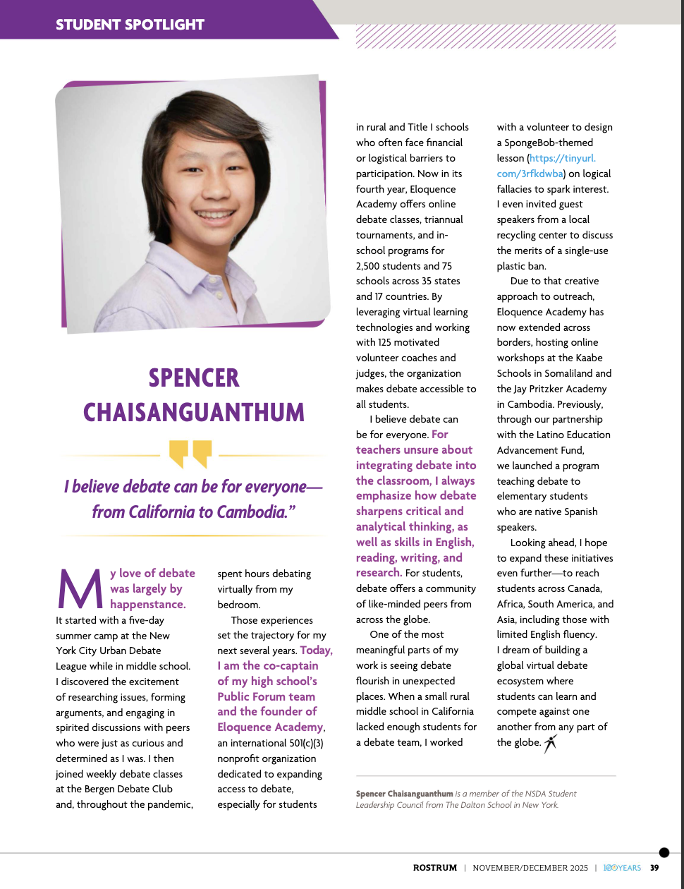 Spencer is proud to lead the world’s largest youth-led debate organization and meet the challenges of the 21st century.